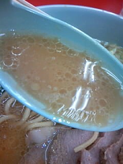 | 中〜太麺のややちじれ麺。スープは家系の醤油とんこつ。チャーシューはトロトロではなく、しっかりとした歯ごたえがあります。 |